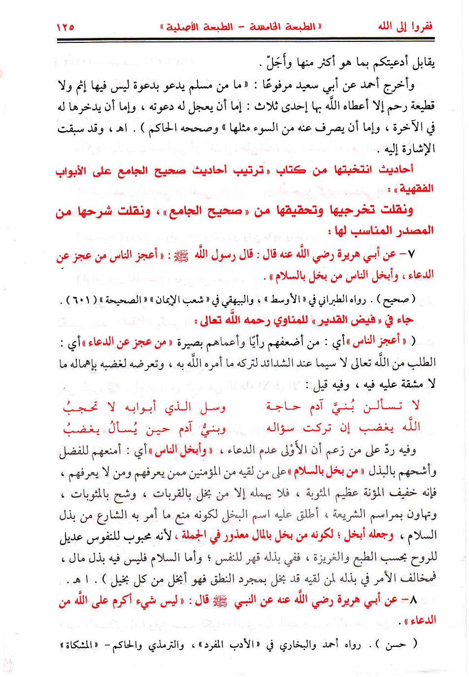 7 - عن أبي هريرة رضي اللَّه عنه قال: قال رسول اللَّه - صَلَّى اللهُ عَلَيْهِ وَسَلَّمَ -: «أعجز الناس من عجز عن الدعاء، وأبخل الناس من بخل بالسلام».