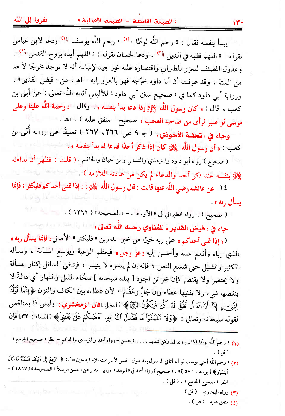 يبدأ بنفسه فقال: (رحم اللَّه لوطًا) (¬1) (رحم اللَّه يوسف) (¬2) ودعا لابن عباس بقوله: (اللهم فقهه في الدين) (¬3)، ودعا لحسان بقوله: «اللهم أيده بروح القدس» (¬4). وعدول المصنف للعزو للطبراني واقتصاره عليه غير جيد لإبهامه أنه لا يوجد مخرجًا لأحد من الستة، وقد عرفت أن أبا داود خرّجه فهو بالعزو إليه أحق. اهـ. من «فيض القدير». ورواية أبي داود كما في «صحيح سنن أبي داود» للألباني أثابه اللَّه تعالى: (عن أبي بن كعب، قال: كان رسول اللَّه - صَلَّى اللهُ عَلَيْهِ وَسَلَّمَ - إذا دعا بدأ بنفسه). وقال: «رحمة اللَّه علينا وعلى موسى لو صبر لرأى من صاحبه العجب» صحيح - متفق عليه). اهـ.