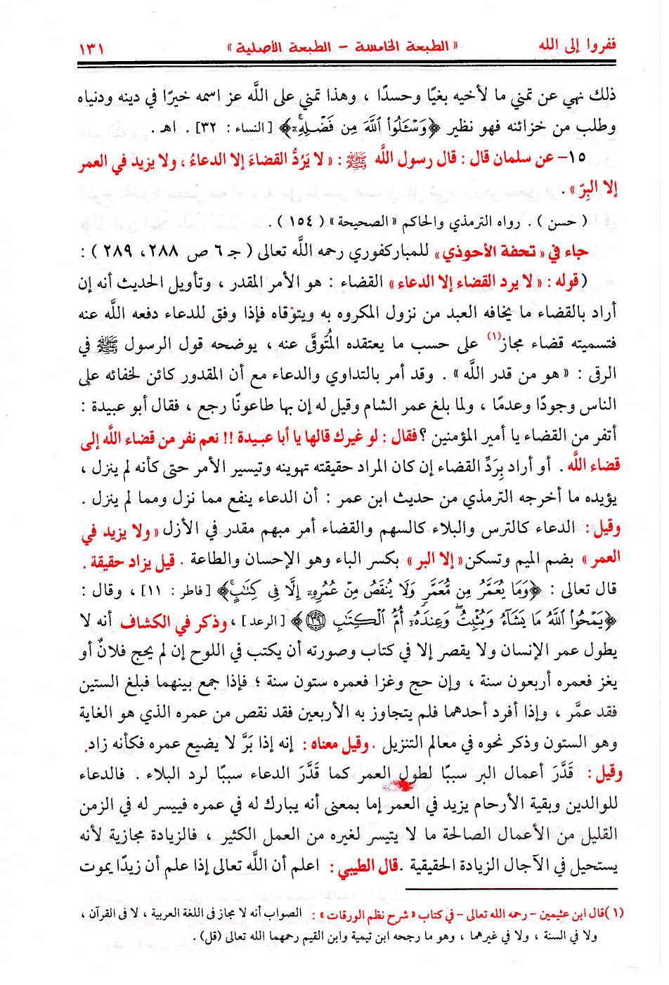 (قوله: «لا يرد القضاء إلا الدعاء» القضاء هو الأمر المقدر، وتأويل الحديث أنه إن أراد بالقضاء ما يخافه العبد من نزول المكروه به ويتوقاه فإذا وفق للدعاء دفعه اللَّه عنه فتسميته قضاء مجاز على حسب ما يعتقده المتوقى عنه، يوضحه قول الرسول - صَلَّى اللهُ عَلَيْهِ وَسَلَّمَ - في الرقى: «هو من قدر اللَّه». وقد أمر بالتداوي والدعاء مع أن المقدور كائن لخفائه على الناس وجودًا وعدمًا، ولما بلغ عمر الشام وقيل له إن بها طاعونًا رجع، فقال أبو عبيدة: أتفر من القضاء يا أمير المؤمنين؟ فقال: لو غيرك قالها يا أبا عبيدة!! نعم نفر من قضاء اللَّه إلى قضاء اللَّه. أو أراد برد القضاء إن كان المراد حقيقته تهوينه وتيسير الأمر حتى كأنه لم ينزل، يؤيده ما أخرجه الترمذي من حديث ابن عمر: أن الدعاء ينفع مما نزل ومما لم ينزل. وقيل: الدعاء كالترس والبلاء كالسهم والقضاء أمر مبهم مقدر في الأزل «ولا يزيد في العمر» بضم الميم وتسكن «إلا البر» بكسر الباء وهو الإحسان والطاعة. قيل يزاد حقيقة. قال تعالى: {وَمَا يُعَمَّرُ مِن مُّعَمَّرٍ وَلاَ يُنقَصُ مِنْ عُمُرِهِ إِلاَّ فِي كِتَابٍ} [فاطر: 11]، وقال: {يَمْحُو اللَّهُ مَا يَشَاءُ وَيُثْبِتُ وَعِندَهُ أُمُّ الْكِتَابِ} [الرعد: 39]، وذكر في الكشاف أنه لا يطول عمر الإنسان ولا يقصر إلا في كتاب وصورته أن يكتب في اللوح إن لم يحج فلانٌ أو يغز فعمره أربعون سنة، وإن حج وغزا فعمره ستون سنة؛ فإذا جمع بينهما فبلغ الستين فقد عمَّر، وإذا أفرد أحدهما فلم يتجاوز به الأربعين فقد نقص من عمره الذي هو الغاية وهو الستون وذكر نحوه في معالم التنزيل. وقيل معناه: إنه إذا بر لا يضيع عمره فكأنه زاد. وقيل: قدر أعمال البر سببًا لطول العمر كما قدر الدعاء سببًا لرد البلاء. فالدعاء للوالدين وبقية الأرحام يزيد في العمر إما بمعنى أنه يبارك له في عمره فييسر له في الزمن القليل من الأعمال الصالحة ما لا يتيسر لغيره من العمل الكثير فالزيادة مجازية لأنه يستحيل في الآجال الزيادة الحقيقية. قال الطيبي: اعلم أن اللَّه تعالى إذا علم أن زيدًا يموت