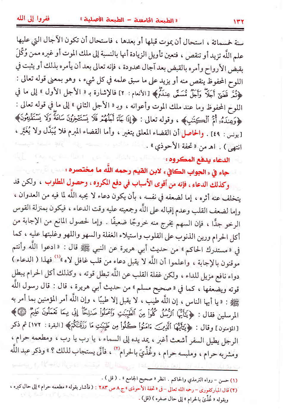 سنة خمسمائة، استحال أن يموت قبلها أو بعدها، فاستحال أن تكون الآجال التي عليها علم اللَّه تزيد أو تنقص، فتعين تأويل الزيادة أنها بالنسبة إلى ملك الموت أو غيره ممن وكل بقبض الأرواح وأمره بالقبض بعد آجال محدودة، فإنه تعالى بعد أن يأمره بذلك أو يثبت في اللوح المحفوظ ينقص منه أو يزيد على ما سبق علمه في كل شيء، وهو بمعنى قوله تعالى: {ثُمَّ قَضَى أَجَلاً وَأَجَلٌ مُّسمًّى عِندَهُ} [الأنعام: 2] فالإشارة بالأجل الأول إلى ما في اللوح المحفوظ وما عند ملك الموت وأعوانه، وبالأجل الثاني إلى ما في قوله تعالى: {وَعِندَهُ أُمُّ الْكِتَابِ}، وقوله تعالى: {إِذَا جَاء أَجَلُهُمْ فلاَ يَسْتَأْخِرُونَ سَاعَةً وَلاَ يَسْتَقْدِمُونَ} [يونس: 49]. والحاصل أن القضاء المعلق يتغير، وأما القضاء المبرم فلا يبدل ولا يغيره، انتهى). اهـ من «تحفة الأحوذي».