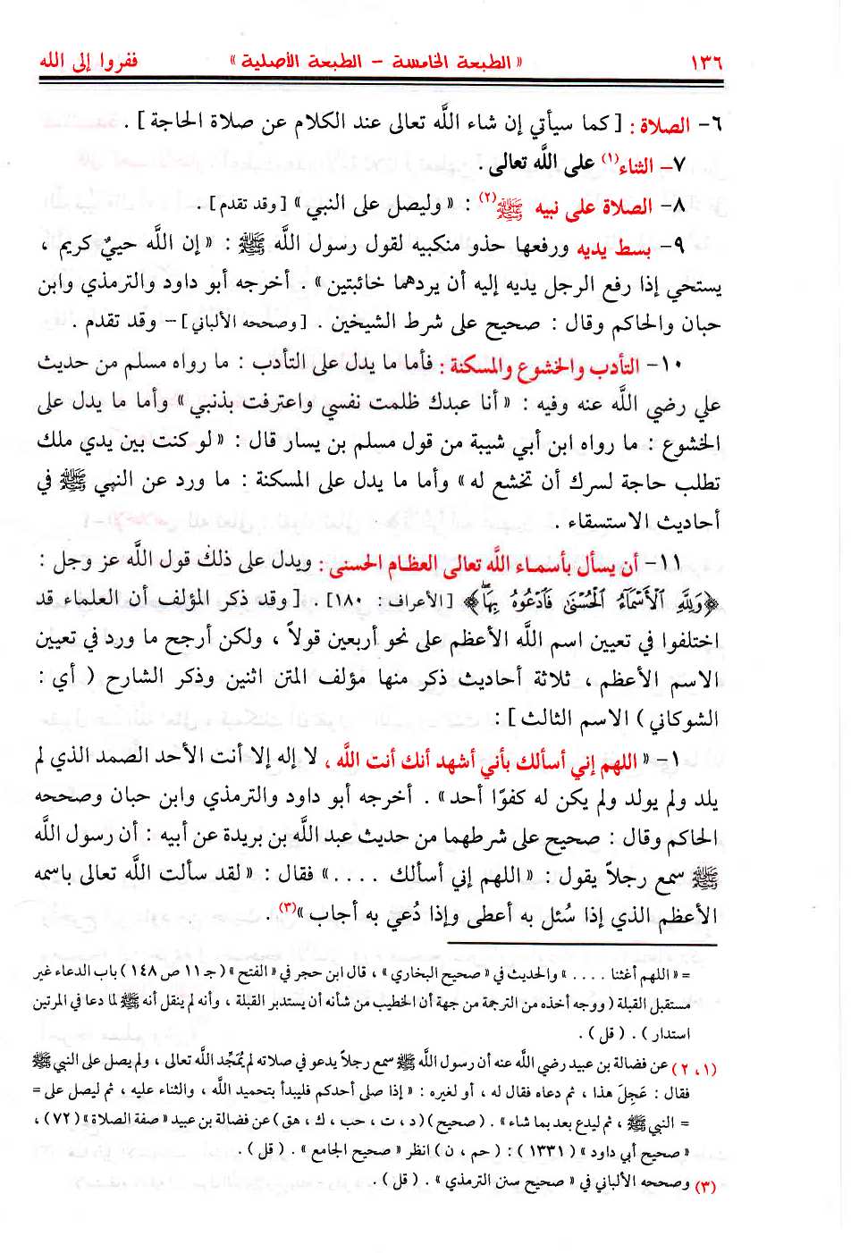 (¬1) و (¬2) عن فضالة بن عبيد رضي اللَّه عنه أن رسول اللَّه - صَلَّى اللهُ عَلَيْهِ وَسَلَّمَ - سمع رجلاً يدعو في صلاته لم يمجد اللَّه تعالى، ولم يصل على النبي - صَلَّى اللهُ عَلَيْهِ وَسَلَّمَ - فقال: عجل هذا، ثم دعاه فقال له، أو لغيره: «إذا صلى أحدكم فليبدأ بتحميد اللَّه، والثناء عليه، ثم ليصل على النبي، ثم ليدع بعد بما شاء». (صحيح) (د، ت، حب، ك، هق) عن فضالة بن عبيد «صفة الصلاة» (72)، «صحيح أبي داود» (1331): (حم، ن) انظر «صحيح الجامع». (قل).