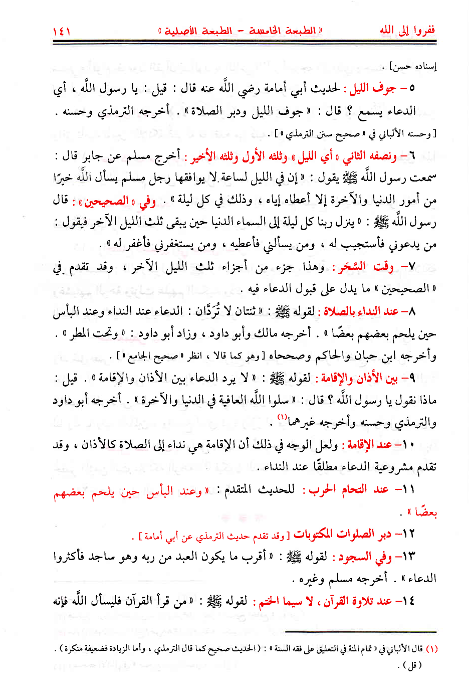6 - ونصفه الثاني «أي الليل» وثلثه الأول وثلثه الأخير: أخرج مسلم عن جابر قال: سمعت رسول اللَّه - صَلَّى اللهُ عَلَيْهِ وَسَلَّمَ - يقول: «إن في الليل لساعة لا يوافقها رجل مسلم يسأل اللَّه خيرًا من أمور الدنيا والآخرة إلا أعطاه إياه، وذلك في كل ليلة». وفي «الصحيحين»: قال رسول اللَّه - صَلَّى اللهُ عَلَيْهِ وَسَلَّمَ -: «ينزل ربنا كل ليلة إلى السماء الدنيا حين يبقى ثلث الليل الآخر فيقول: من يدعوني فأستجيب له، ومن يسألني فأعطيه، ومن يستغفرني فأغفر له».