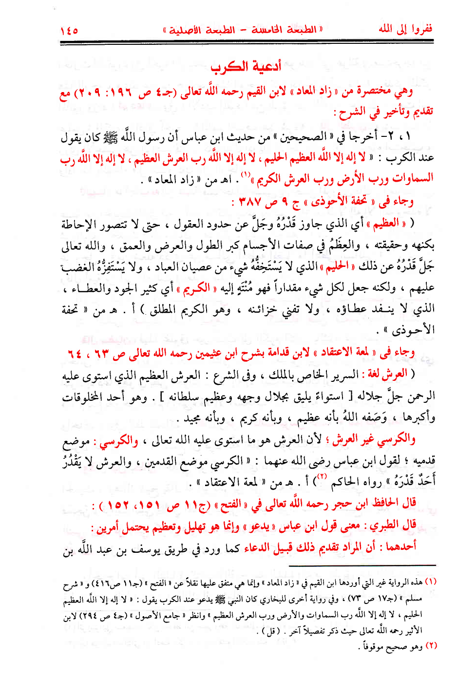 خامسًا: أدعية الكرب: وهي مختصرة من «زاد المعاد» لابن القيم رحمه اللَّه تعالى (جـ4 ص 196: 209) مع تقديم وتأخير في الشرح: