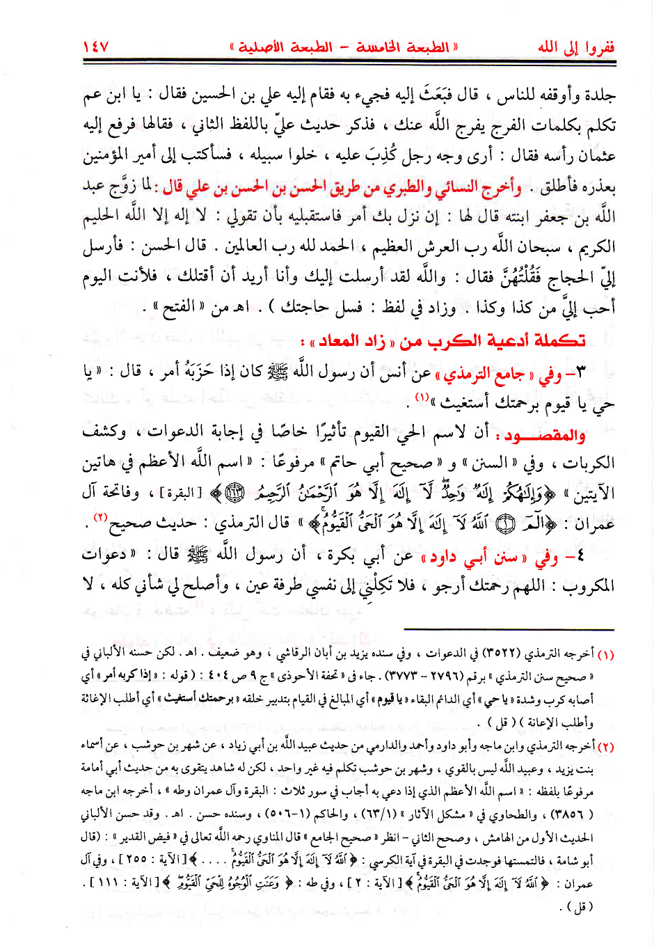3 - وفي «جامع الترمذي» عن أنس أن رسول اللَّه - صَلَّى اللهُ عَلَيْهِ وَسَلَّمَ - كان إذا حزبه أمر، قال: «يا حي يا قيوم برحمتك أستغيث» (¬1).