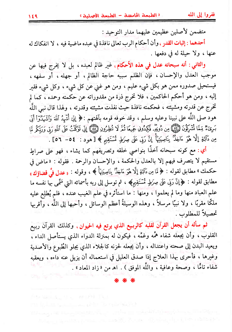 والثاني: أنه سبحانه عدل في هذه الأحكام، غير ظالم لعبده، بل لا يخرج فيها عن موجب العدل والإحسان، فإن الظلم سببه حاجة الظالم، أو جهله، أو سفهه، فيستحيل صدوره ممن هو بكل شيء عليم، ومن هو غني عن كل شيء، وكل شيء فقير إليه، ومن هو أحكم الحاكمين، فلا تخرج ذرة من مقدوراته عن حكمته وحمده، كما لم تخرج عن قدرته ومشيئته، فحكمته نافذة حيث نفذت مشيئته وقدرته، ولهذا قال نبي اللَّه هود صلى اللَّه على نبينا وعليه وسلم، وقد خوفه قومه بآلهتهم: {إِنِّي أُشْهِدُ اللَّهَ وَاشْهَدُواْ أَنِّي بَرِيءٌ مِّمَّا تُشْرِكُونَ - مِن دُونِهِ فَكِيدُونِي جَمِيعًا ثُمَّ لاَ تُنظِرُونِ - إِنِّي تَوَكَّلْتُ عَلَى اللَّهِ رَبِّي وَرَبِّكُم مَّا مِن دَآبَّةٍ إِلاَّ هُوَ آخِذٌ بِنَاصِيَتِهَا إِنَّ رَبِّي عَلَى صِرَاطٍ مُّسْتَقِيمٍ} [هود: 54 - 56].