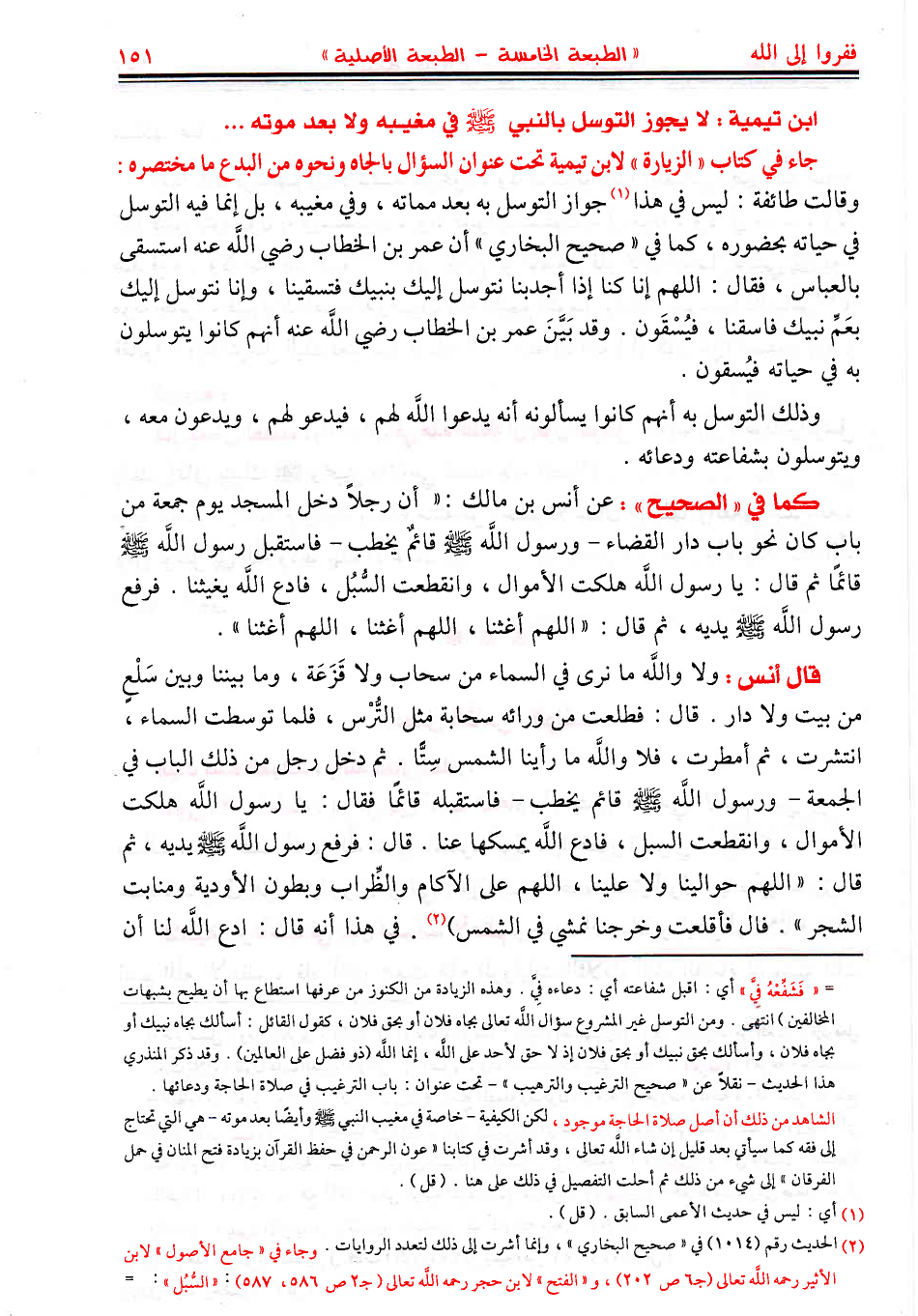 جاء في كتاب «الزيارة» لابن تيمية تحت عنوان السؤال بالجاه ونحوه من البدع ما مختصره: وقالت طائفة: ليس في هذا (¬1) جواز التوسل به بعد مماته، وفي مغيبه، بل إنما فيه التوسل في حياته بحضوره، كما في «صحيح البخاري» أن عمر بن الخطاب رضي اللَّه عنه استسقى بالعباس، فقال: اللهم إنا كنا إذا أجدبنا نتوسل إليك بنبيك فتسقينا، وإنا نتوسل إليك بعم نبيك فاسقنا، فيسقون. وقد بين عمر بن الخطاب رضي اللَّه عنه أنهم كانوا يتوسلون به في حياته فيسقون.