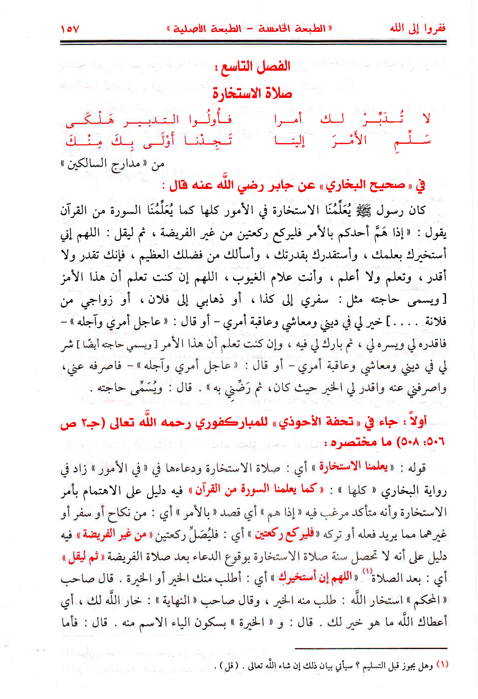في «صحيح البخاري» عن جابر رضي اللَّه عنه قال: كان رسول - صَلَّى اللهُ عَلَيْهِ وَسَلَّمَ - يعلمنا الاستخارة في الأمور كلها كما يعلمنا السورة من القرآن يقول: «إذا هم أحدكم بالأمر فليركع ركعتين من غير الفريضة، ثم ليقل: اللهم إني أستخيرك بعلمك، وأستقدرك بقدرتك، وأسألك من فضلك العظيم، فإنك تقدر ولا أقدر، وتعلم ولا أعلم، وأنت علام الغيوب، اللهم إن كنت تعلم أن هذا الأمر [ويسمى حاجته مثل: سفري إلى كذا، أو ذهابي إلى فلان، أو زواجي من فلانة .... ] خير لي في ديني ومعاشي وعاقبة أمري - أو قال: «عاجل أمري وآجله» - فاقدره لي ويسره لي، ثم بارك لي فيه، وإن كنت تعلم أن هذا الأمر [ويسمي حاجته أيضًا] شر لي في ديني ومعاشي وعاقبة أمري - أو قال: «عاجل أمري وآجله» - فاصرفه عني، واصرفني عنه واقدر لي الخير حيث كان، ثم رضني به». قال: ويسمى حاجته.