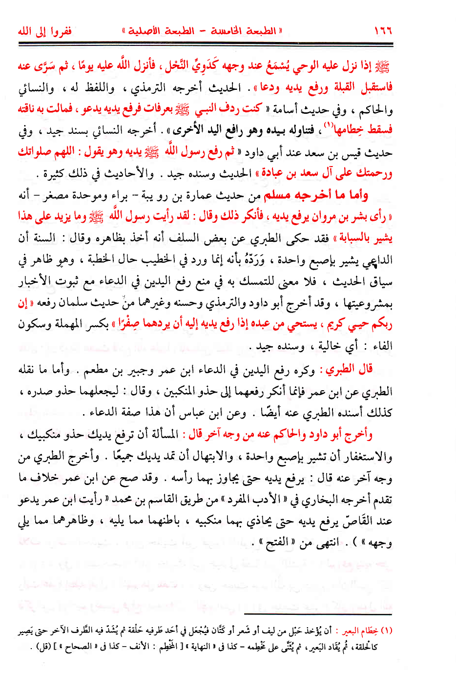 - صَلَّى اللهُ عَلَيْهِ وَسَلَّمَ - إذا نزل عليه الوحي يسمع عند وجهه كدوي النحل، فأنزل اللَّه عليه يومًا، ثم سرى عنه فاستقبل القبلة ورفع يديه ودعا». الحديث أخرجه الترمذي، واللفظ له، والنسائي والحاكم، وفي حديث أسامة «كنت ردف النبي - صَلَّى اللهُ عَلَيْهِ وَسَلَّمَ - بعرفات فرفع يديه يدعو، فمالت به ناقته فسقط خطامها، فتناوله بيده وهو رافع اليد الأخرى». أخرجه النسائي بسند جيد، وفي حديث قيس بن سعد عند أبي داود «ثم رفع رسول اللَّه - صَلَّى اللهُ عَلَيْهِ وَسَلَّمَ - يديه وهو يقول: اللهم صلواتك ورحمتك على آل سعد بن عبادة» الحديث وسنده جيد. والأحاديث في ذلك كثيرة: وأما ما أخرجه مسلم من حديث عمارة بن رو يبة - براء وموحدة مصغر - أنه «رأى بشر بن مروان يرفع يديه، فأنكر ذلك وقال: لقد رأيت رسول اللَّه - صَلَّى اللهُ عَلَيْهِ وَسَلَّمَ - وما يزيد على هذا يشير بالسبابة» فقد حكى الطبري عن بعض السلف أنه أخذ بظاهره وقال: السنة أن الداعي يشير بإصبع واحدة، ورده بأنه إنما ورد في الخطيب حال الخطبة، وهو ظاهر في سياق الحديث فلا معنى للتمسك به في منع رفع اليدين في الدعاء مع ثبوت الأخبار بمشروعيتها، وقد أخرج أبو داود والترمذي وحسنه وغيرهما من حديث سلمان رفعه «إن ربكم حيي كريم يستحي من عبده إذا رفع يديه إليه أن يردهما صِفْرًا» بكسر المهملة وسكون الفاء أي خالية، وسنده جيد.