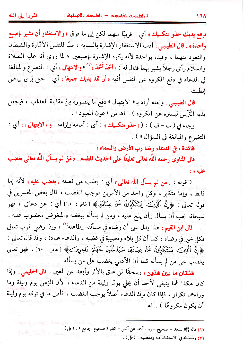 قال الطيبي: أدب الاستغفار الإشارة بالسبابة سبًا للنفس الأمَّارة والشيطان والتعوذ منهما، وقيده بواحدة لأنه يكره الإشارة بإصبعين لما روي أنه عليه الصلاة والسلام رأى رجلاً يشير بهما فقال له: أحِّد أحد (¬1) «والابتهال» أي: التضرع والمبالغة في الدعاء في دفع المكروه عن النفس أدبه «أن تمد يديك جميعًا» أي: حتى يرى بياض إبطيك.