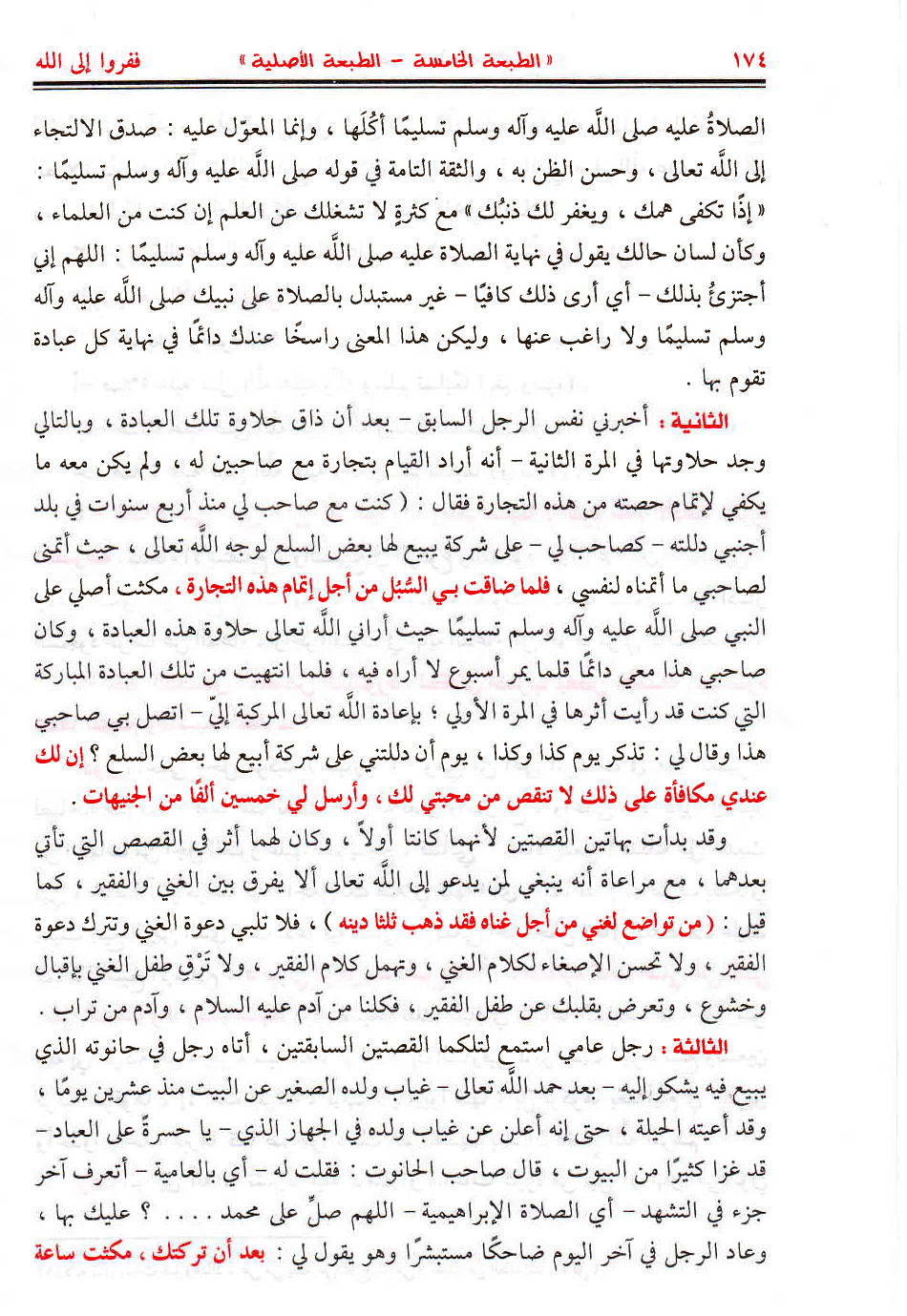 الثالثة: رجل عامي استمع لتلكما القصتين السابقتين، أتاه رجل في حانوته الذي يبيع فيه يشكو إليه، بعد حمد اللَّه تعالى - غياب ولده الصغير عن البيت منذ عشرين يومًا، وقد أعيته الحيلة، حتى إنه أعلن عن غياب ولده في الجهاز الذي - يا حسرةً على العباد - قد غزا كثيرًا من البيوت، قال صاحب الحانوت: فقلت له - أي بالعامية - أتعرف آخر جزء في التشهد - أي الصلاة الإبراهيمية - اللهم صلِّ على محمد .... ؟ عليك بها، وعاد الرجل في آخر اليوم ضاحكًا مستبشرًا وهو يقول لي: بعد أن تركتك، مكثت ساعة