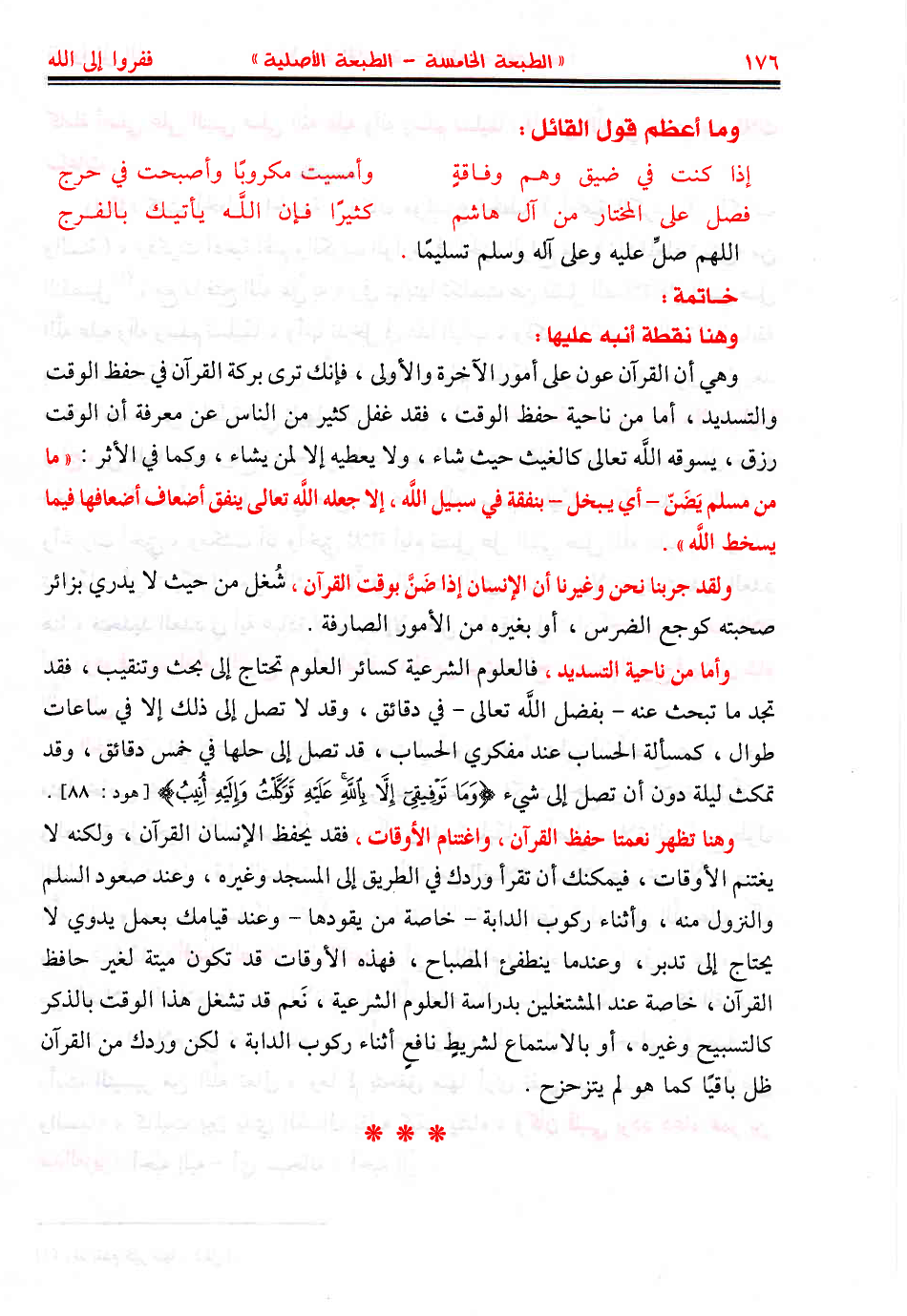 وهي أن القرآن عون على أمور الآخرة والأولى، فإنك ترى بركة القرآن في حفظ الوقت والتسديد، أما من ناحية حفظ الوقت، فقد غفل كثير من الناس عن معرفة أن الوقت رزق، يسوقه اللَّه تعالى كالغيث حيث شاء، ولا يعطيه إلا لمن يشاء، وكما في الأثر: «ما من مسلم يضن - أي يبخل - بنفقة في سبيل اللَّه، إلا جعله اللَّه تعالى ينفق أضعاف أضعافها فيما يسخط اللَّه» ولقد جربنا نحن وغيرنا أن الإنسان إذا ضن بوقت القرآن شُغل من حيث لا يدري بزائر صحبته كوجع الضرس، أو بغيره من الأمور الصارفة، وأما من ناحية التسديد، فالعلوم الشرعية كسائر العلوم تحتاج إلى بحث وتنقيب، فقد تجد ما تبحث عنه - بفضل اللَّه تعالى - في دقائق، وقد لا تصل إلى ذلك إلا في ساعات طوال، كمسألة الحساب عند مفكري الحساب، قد تصل إلى حلها في خمس دقائق، وقد تمكث ليلة دون أن تصل إلى شيء {وَمَا تَوْفِيقِي إِلاَّ بِاللَّهِ عَلَيْهِ تَوَكَّلْتُ وَإِلَيْهِ أُنِيبُ} [هود: 88].