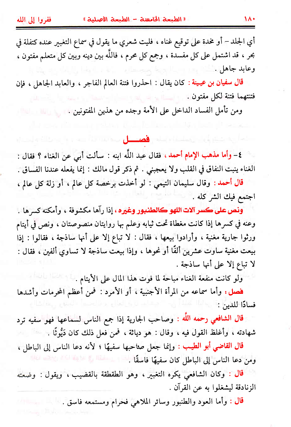 4 - وأما مذهب الإمام أحمد، فقال عبد اللَّه ابنه: سألت أبي عن الغناء؟ فقال: الغناء ينبت النفاق في القلب ولا يعجبني. ثم ذكر قول مالك: إنما يفعله عندنا الفساق.