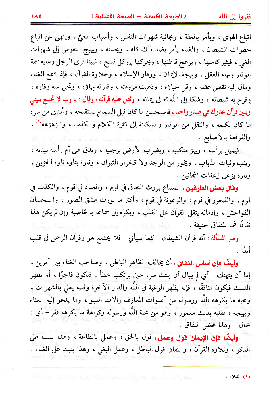 وأيضًا فإن الإيمان قول وعمل، قول بالحق، وعمل بالطاعة، وهذا ينبت على الذكر، وتلاوة القرآن، والنفاق قول الباطل، وعمل البغي، وهذا ينبت على الغناء.