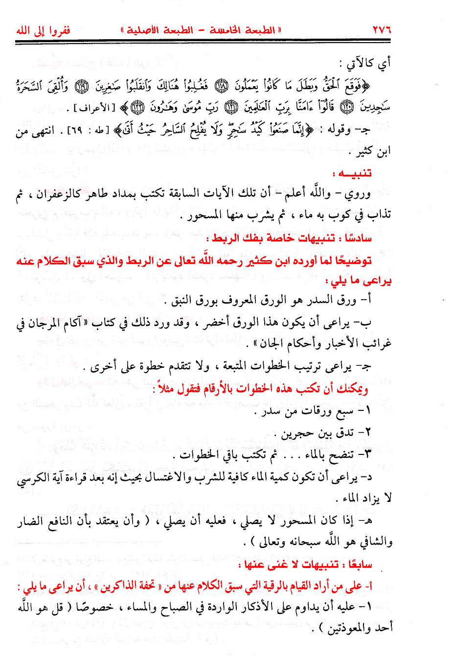 أ- على من أراد القيام بالرقية التي سبق الكلام عنها من «تحفة الذاكرين»، أن يراعى ما يلي: