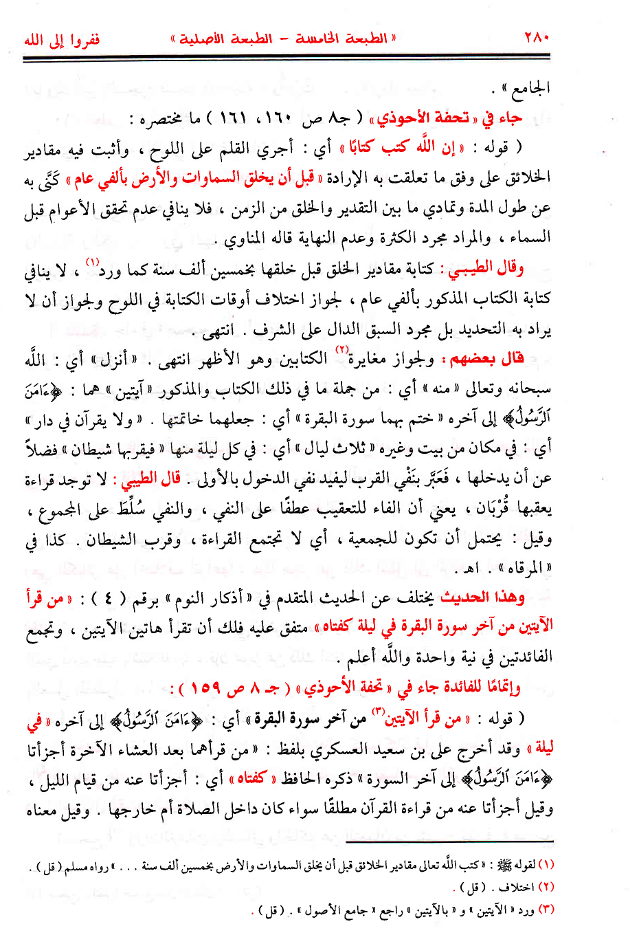 وهذا الحديث يختلف عن الحديث المتقدم في «أذكار النوم» برقم (4): «من قرأ الآيتين من آخر سورة البقرة في ليلة كفتاه» متفق عليه فلك أن تقرأ هاتين الآيتين، وتجمع الفائدتين في نية واحدة واللَّه أعلم، وإتمامًا للفائدة جاء في «تحفة الأحوذي» (جـ 8 ص 159): (قوله: «من قرأ الآيتين (¬3) من آخر سورة البقرة» أي: {آمَنَ الرَّسُولُ} إلى آخره «في ليلة» وقد أخرج على بن سعيد العسكري بلفظ: «من قرأهما بعد العشاء الآخرة أجزأتا {آمَنَ الرَّسُولُ} إلى آخر السورة» ذكره الحافظ «كفتاه» أي: أجزأتا عنه من قيام الليل، وقيل أجزأتا عنه من قراءة القرآن مطلقًا سواء كان داخل الصلاة أم خارجها. وقيل معناه
