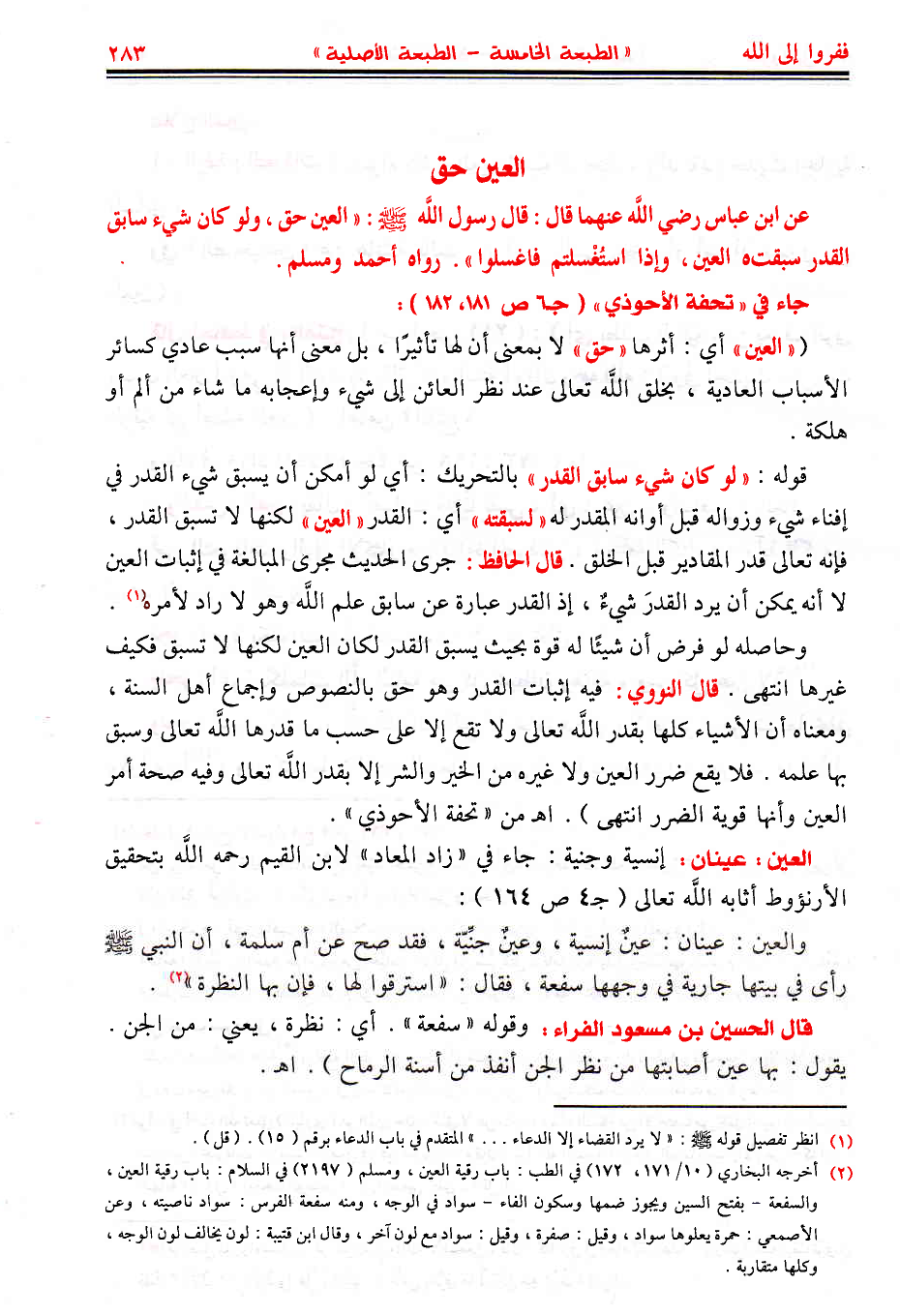 العين: عينان: إنسية وجنية: جاء في «زاد المعاد» لابن القيم رحمه اللَّه بتحقيق الأرنؤوط أثابه اللَّه تعالى (جـ4 ص 164):