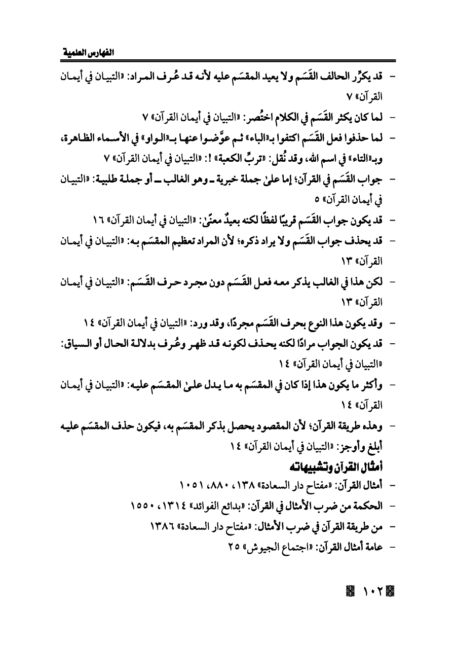 - لما كان يكثر القَسَم في الكلام اختُصر: «التبيان في أيمان القرآن» ٧