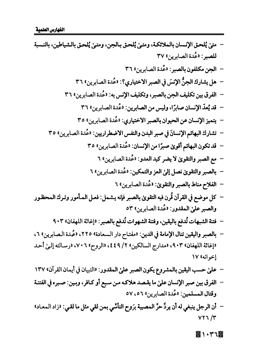 - بالصبر واليقين تنال الإمامة في الدين: «مفتاح دار السعادة» ٢٢٥، «عُدة الصابرين» ٦، «إغاثة اللهفان» ٩٠٣، «مدارج السالكين» ٢/ ٤٤٩، «الروح» ٧٠٦، «رسالته إلى أحد إخوانه» ١٧