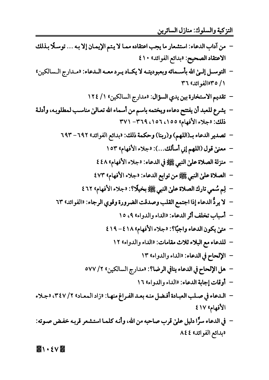 - التوسل إلى الله بأسمائه وبعبوديته لا يكاد يرد معه الدعاء: «مدارج السالكين» ١/ ٣٥ «الفوائد» ٣٦