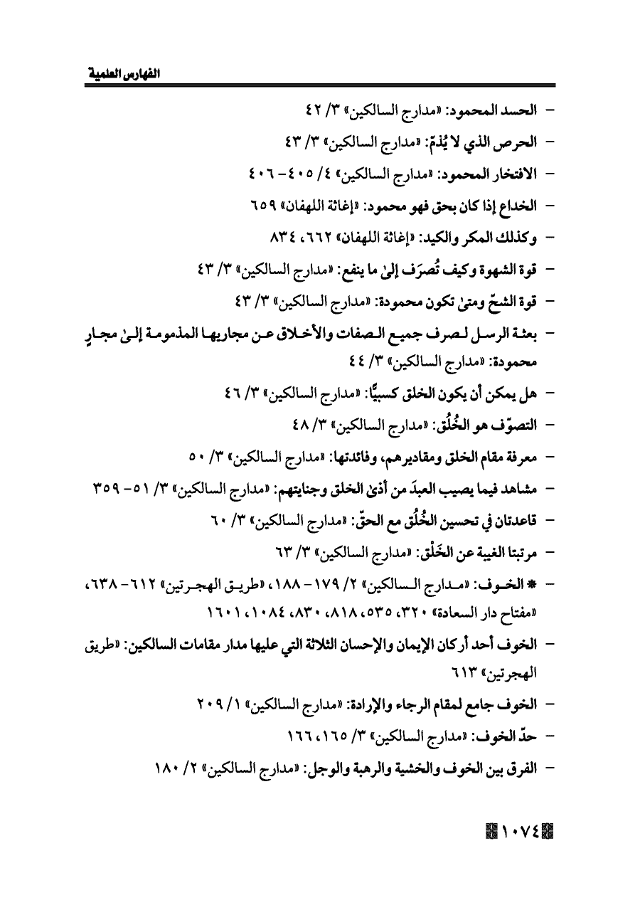 - * الخوف: «مدارج السالكين» ٢/ ١٧٩ - ١٨٨، «طريق الهجرتين» ٦١٢ - ٦٣٨، «مفتاح دار السعادة» ٣٢٠، ٥٣٥، ٨١٨، ٨٣٠، ١٠٨٤، ١٦٠١
