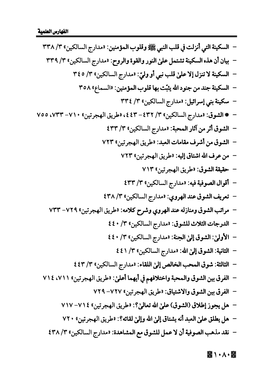 - مراتب الشوق ومنازله عند الهروي وشرح كلامه: «طريق الهجرتين» ٧٢٩ - ٧٣٣