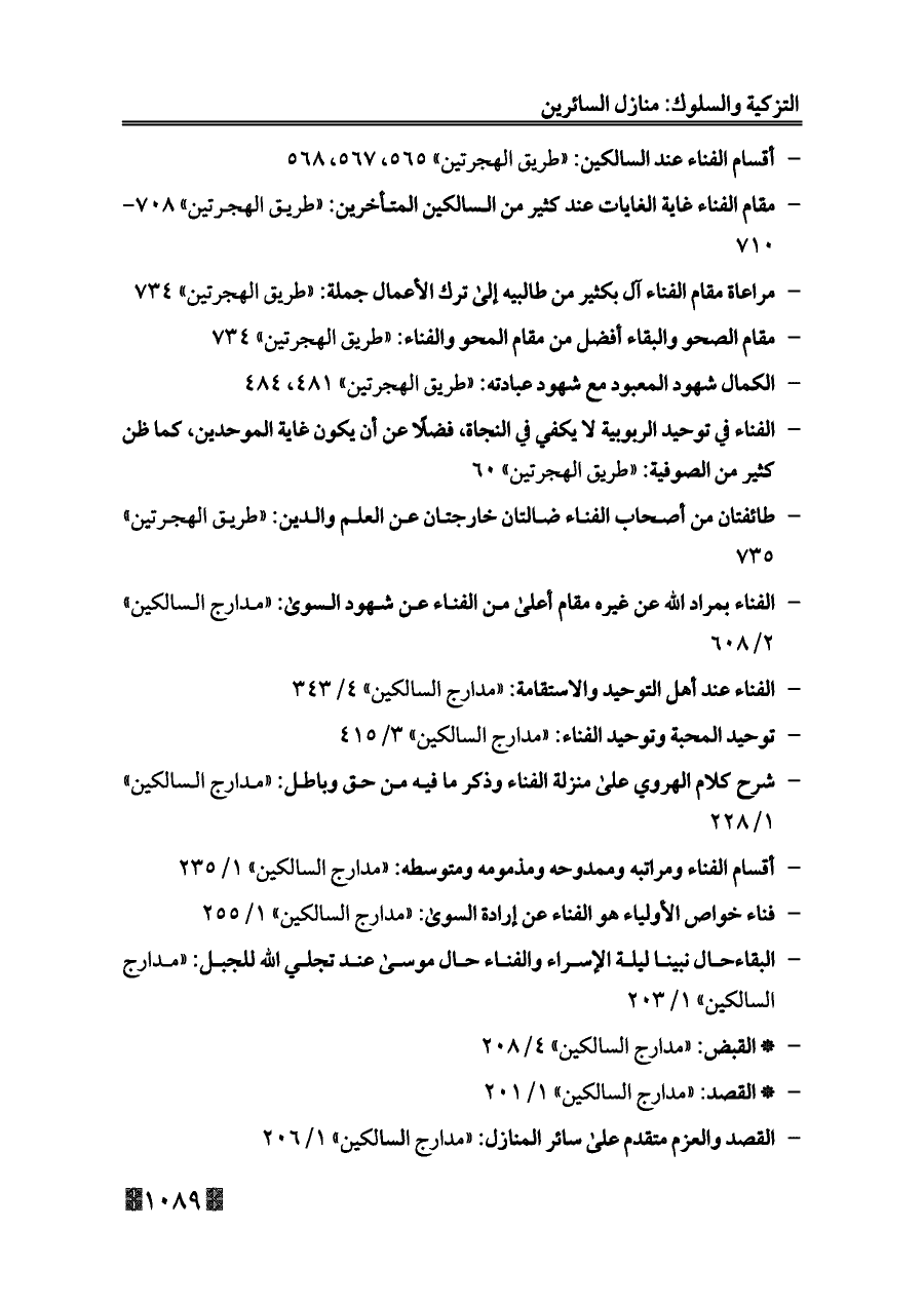 - أقسام الفناء عند السالكين: «طريق الهجرتين» ٥٦٥، ٥٦٧، ٥٦٨