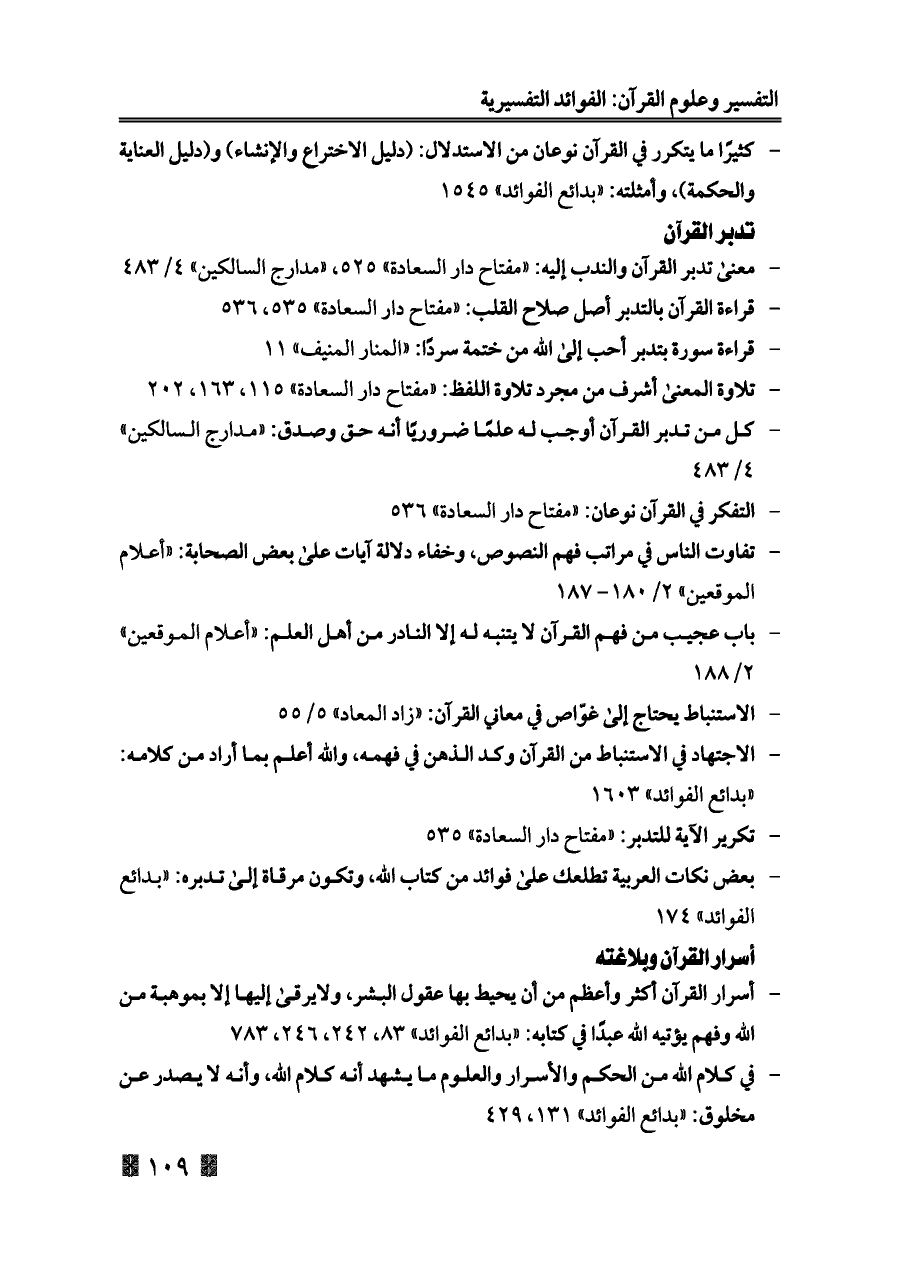 - معنى تدبر القرآن والندب إليه: «مفتاح دار السعادة» ٥٢٥، «مدارج السالكين» ٤/ ٤٨٣