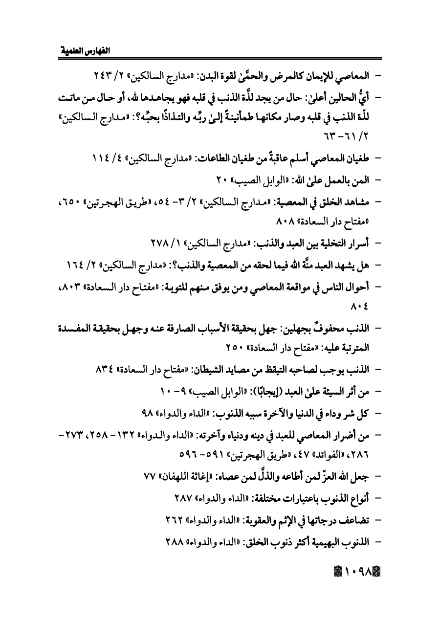 - من أضرار المعاصي للعبد في دينه ودنياه وآخرته: «الداء والدواء» ١٣٢ - ٢٥٨، ٢٧٣ - ٢٨٦، «الفوائد» ٤٧، «طريق الهجرتين» ٥٩١ - ٥٩٦