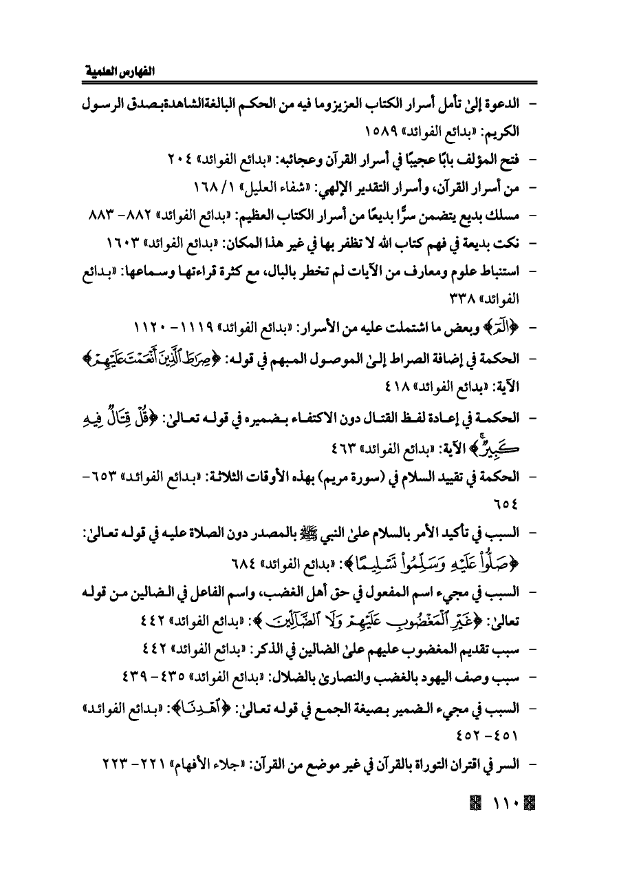 - الدعوة إلى تأمل أسرار الكتاب العزيزوما فيه من الحكم البالغةالشاهدةبصدق الرسول الكريم: «بدائع الفوائد» ١٥٨٩
