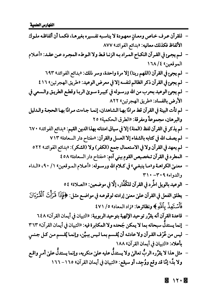 - للقرآن عرف خاص ومعانٍ معهودة لا يناسبه تفسيره بغيرها، فكما أن ألفاظه ملوك الألفاظ فكذلك معانيه: «بدائع الفوائد» ٨٧٧