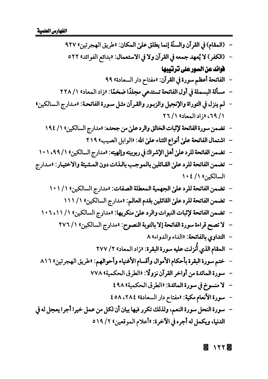 - تضمن الفاتحة لإثبات النبوات والرد على منكريها: «مدارج السالكين» ١/ ١١، ١٠٦