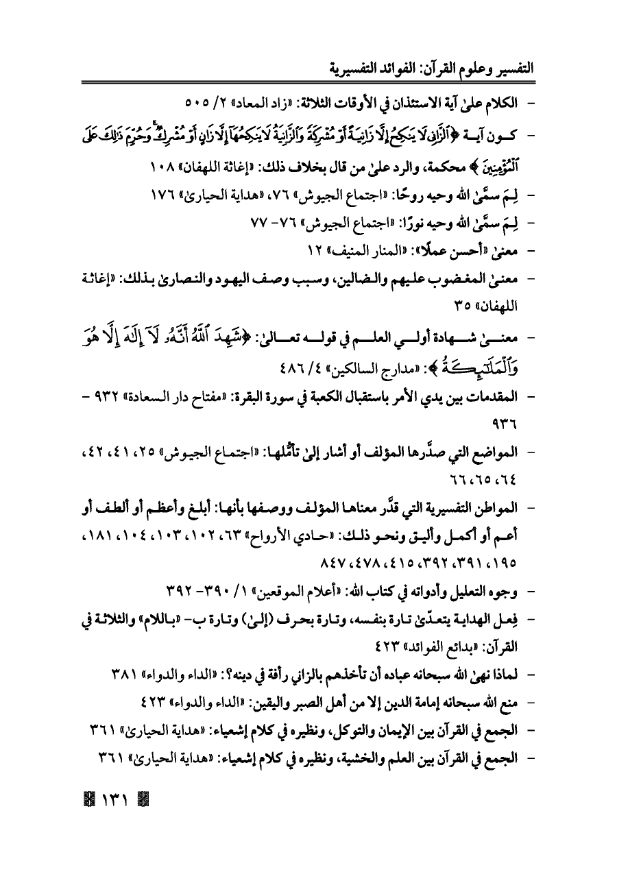 - معنى شهادة أولي العلم في قوله تعالى: {شَهِدَ اللَّهُ أَنَّهُ لَا إِلَهَ إِلَّا هُوَ وَالْمَلَائِكَةُ}: «مدارج السالكين» ٤/ ٤٨٦