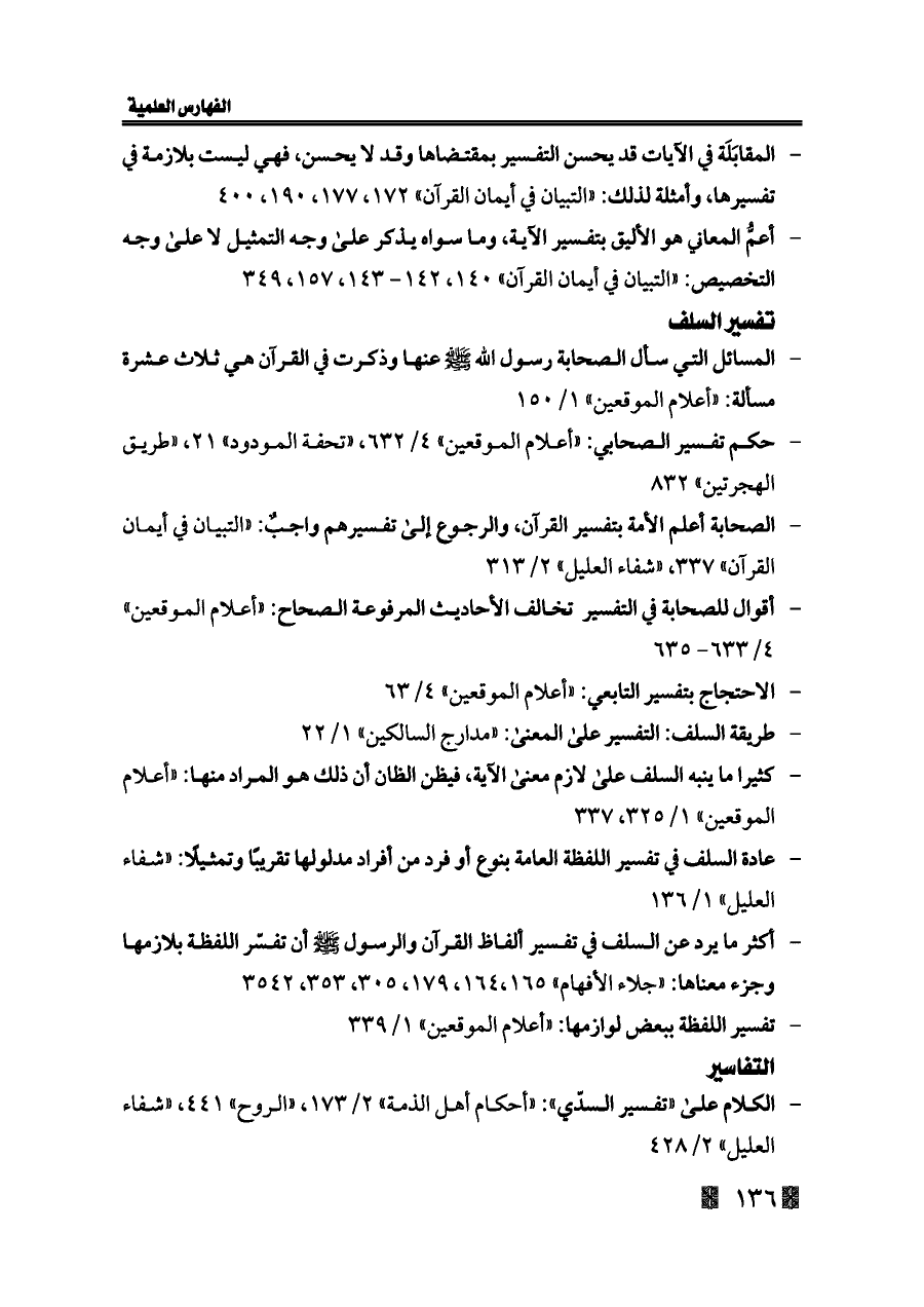 - عادة السلف في تفسير اللفظة العامة بنوع أو فرد من أفراد مدلولها تقريبًا وتمثيلًا: «شفاء العليل» ١/ ١٣٦