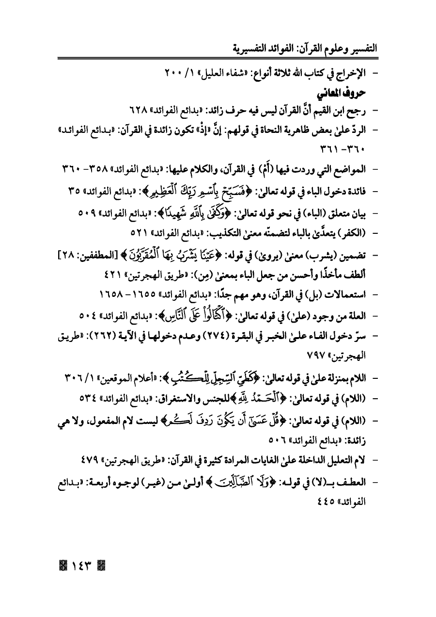 - رجح ابن القيم أنَّ القرآن ليس فيه حرف زائد: «بدائع الفوائد» ٦٢٨