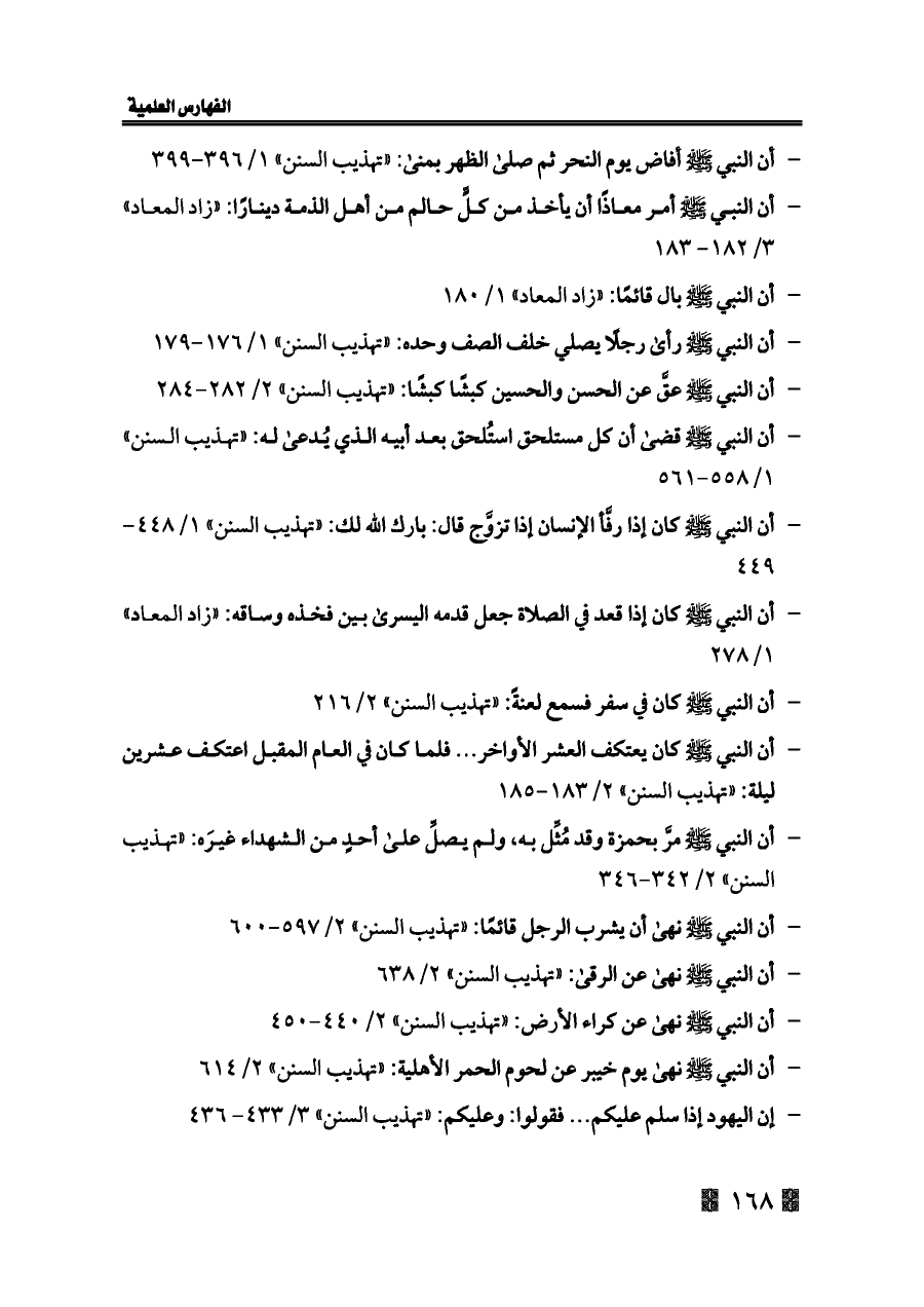 - أن النبي - صلى الله عليه وسلم - عقَّ عن الحسن والحسين كبشًا كبشًا: «تهذيب السنن» ٢/ ٢٨٢ - ٢٨٤