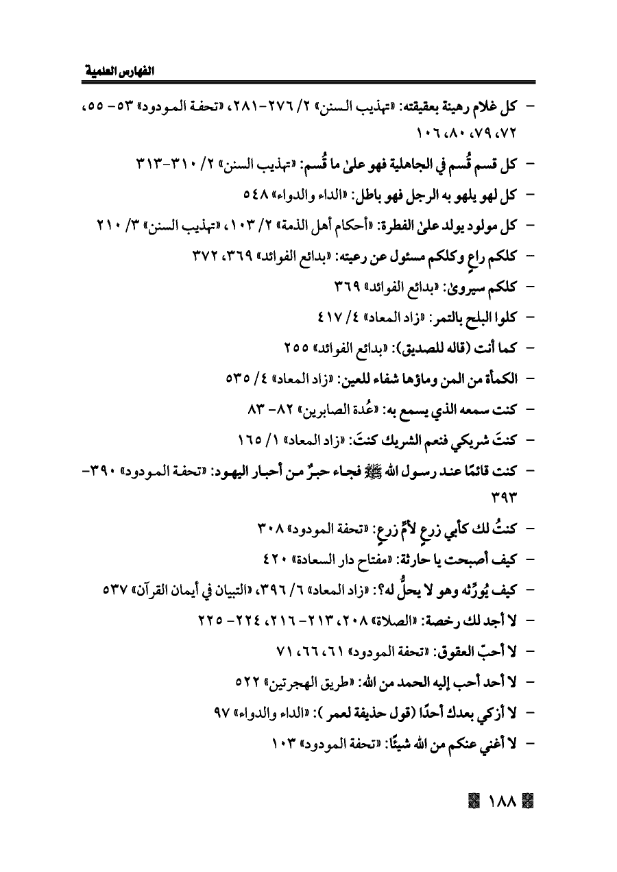 - كل غلام رهينة بعقيقته: «تهذيب السنن» ٢/ ٢٧٦ - ٢٨١، «تحفة المودود» ٥٣ - ٥٥، ٧٢، ٧٩، ٨٠، ١٠٦