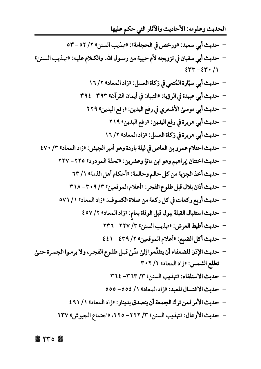 - حديث أبي هريرة في زكاة العسل: «زاد المعاد» ٢/ ١٦