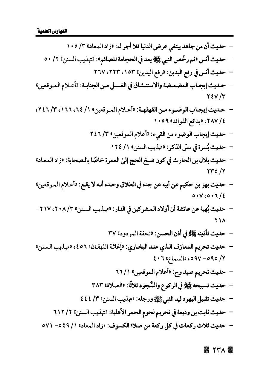 - حديث إيجاب الوضوء من القهقهة: «أعلام الموقعين» ١/ ٦٤، ١٦٦، ٣/ ٢٤٦، ٤/ ٢٨٧، «بدائع الفوائد» ١٠٥٩