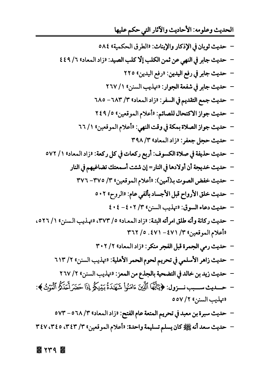 - حديث سعد أنه - صلى الله عليه وسلم - كان يسلم تسليمة واحدة: «أعلام الموقعين» ٣/ ٣٤٣، ٣٤٥، ٣٤٧