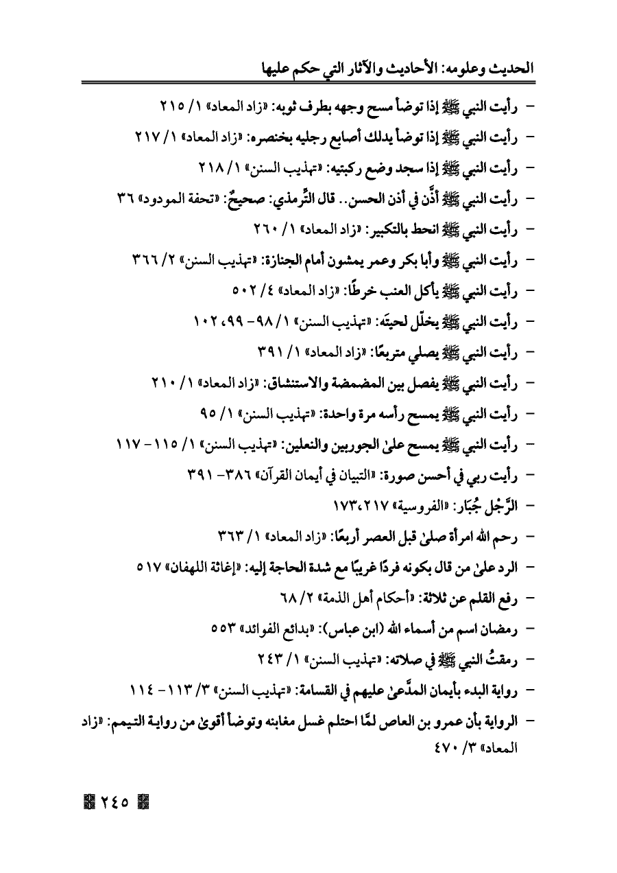 - رأيت النبي - صلى الله عليه وسلم - يمسح رأسه مرة واحدة: «تهذيب السنن» ١/ ٩٥