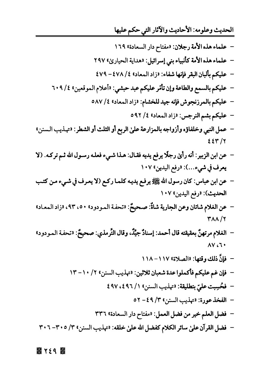 - الغلام مرتهنٌ بعقيقته قال أحمد: إسنادٌ جيِّدٌ، وقال التِّرمذي: صحيحٌ: «تحفة المودود» ٦٠، ٨٧