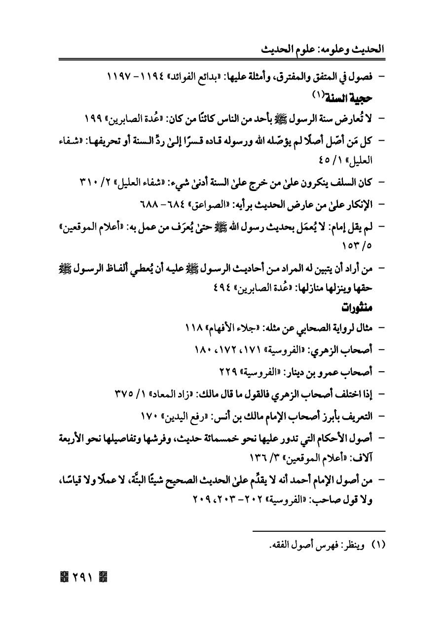 - من أصول الإمام أحمد أنه لا يقدِّم على الحديث الصحيح شيئًا البتَّة، لا عملًا ولا قياسًا، ولا قول صاحب: «الفروسية» ٢٠٢ - ٢٠٣، ٢٠٩