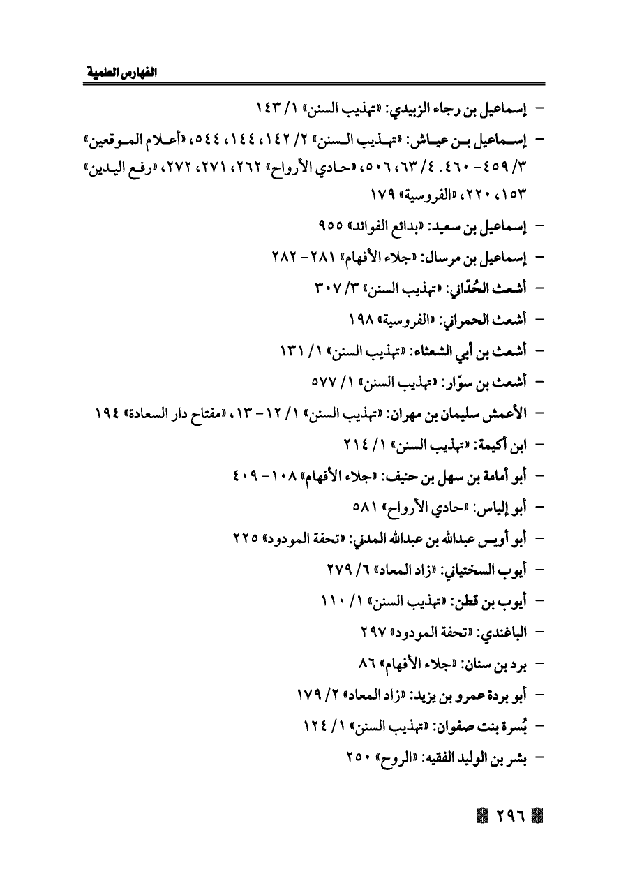 - إسماعيل بن عياش: «تهذيب السنن» ٢/ ١٤٢، ١٤٤، ٥٤٤، «أعلام الموقعين» ٣/ ٤٥٩ - ٤٦٠. ٤/ ٦٣، ٥٠٦، «حادي الأرواح» ٢٦٢، ٢٧١، ٢٧٢، «رفع اليدين» ١٥٣، ٢٢٠، «الفروسية» ١٧٩