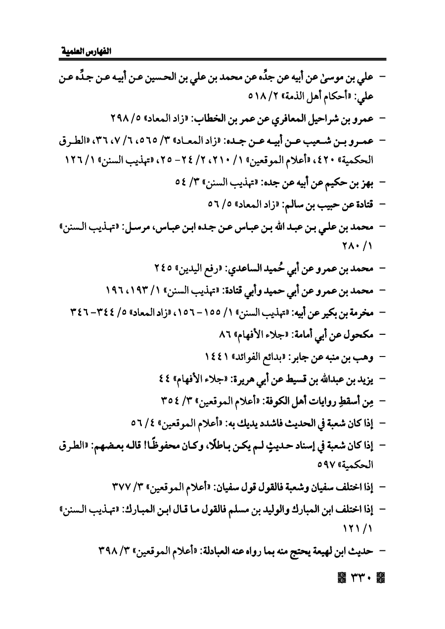 - عمرو بن شعيب عن أبيه عن جده: «زاد المعاد» ٣/ ٥٦٥، ٦/ ٧، ٣٦، «الطرق الحكمية» ٤٢٠، «أعلام الموقعين» ١/ ٢١٠، ٢/ ٢٤ - ٢٥، «تهذيب السنن» ١/ ١٢٦