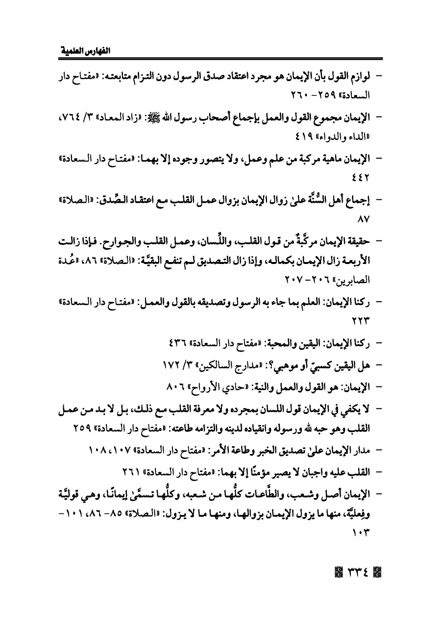 - لوازم القول بأن الإيمان هو مجرد اعتقاد صدق الرسول دون التزام متابعته: «مفتاح دار السعادة» ٢٥٩ - ٢٦٠