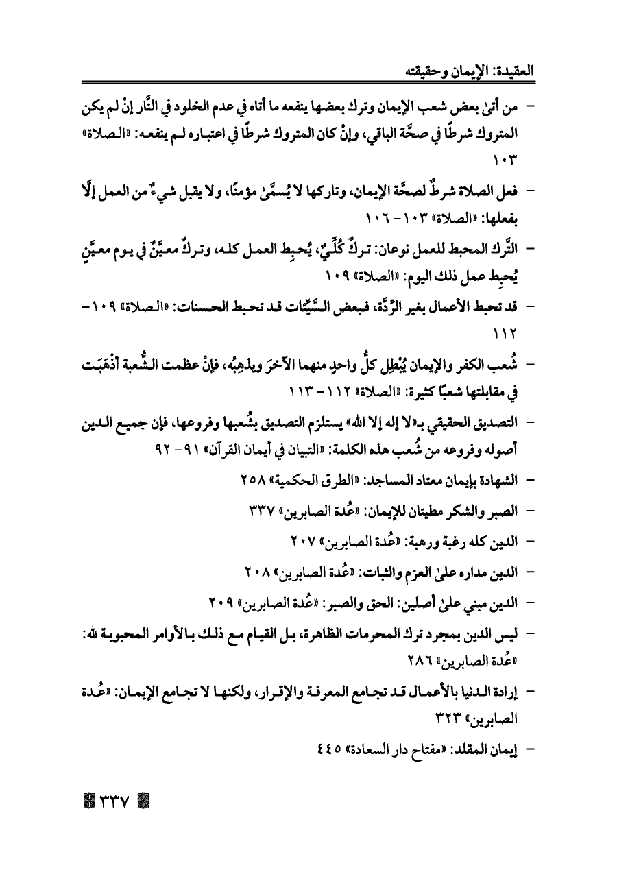- من أتى بعض شعب الإيمان وترك بعضها ينفعه ما أتاه في عدم الخلود في النَّار إنْ لم يكن المتروك شرطًا في صحَّة الباقي، وإنْ كان المتروك شرطًا في اعتباره لم ينفعه: «الصلاة» ١٠٣