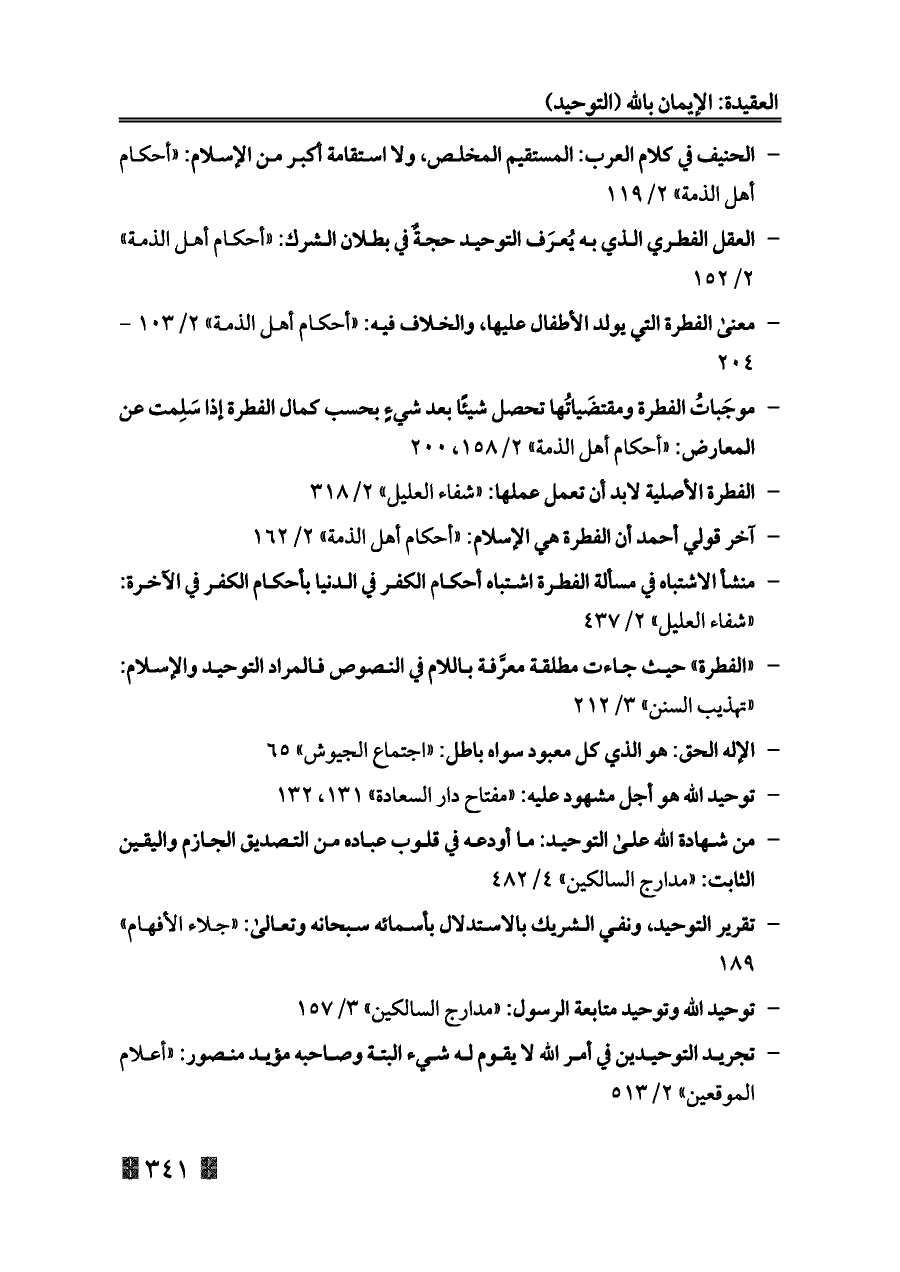 - العقل الفطري الذي به يُعرَف التوحيد حجةٌ في بطلان الشرك: «أحكام أهل الذمة» ٢/ ١٥٢