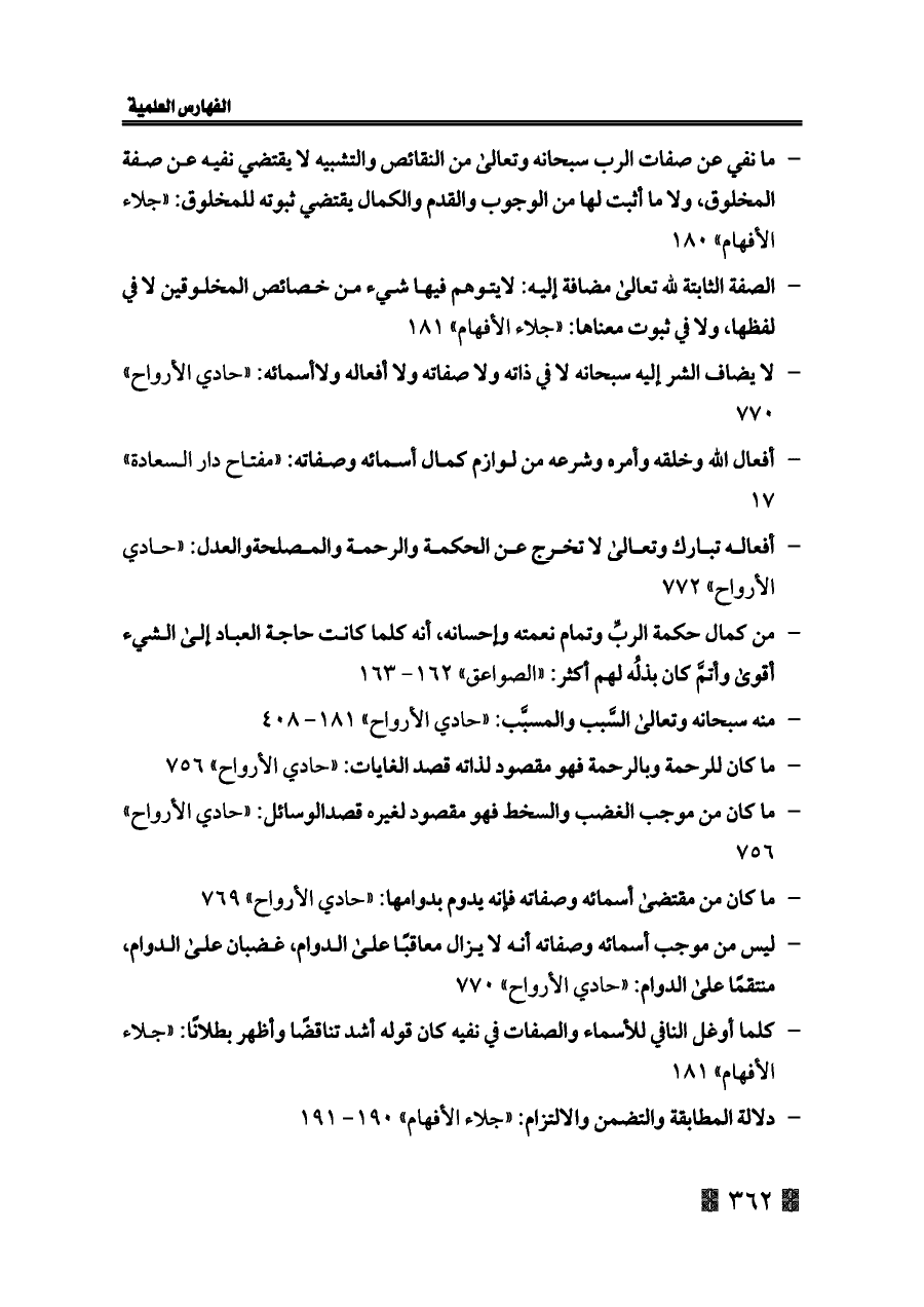 - الصفة الثابتة لله تعالى مضافة إليه: لايتوهم فيها شيء من خصائص المخلوقين لا في لفظها، ولا في ثبوت معناها: «جلاء الأفهام» ١٨١