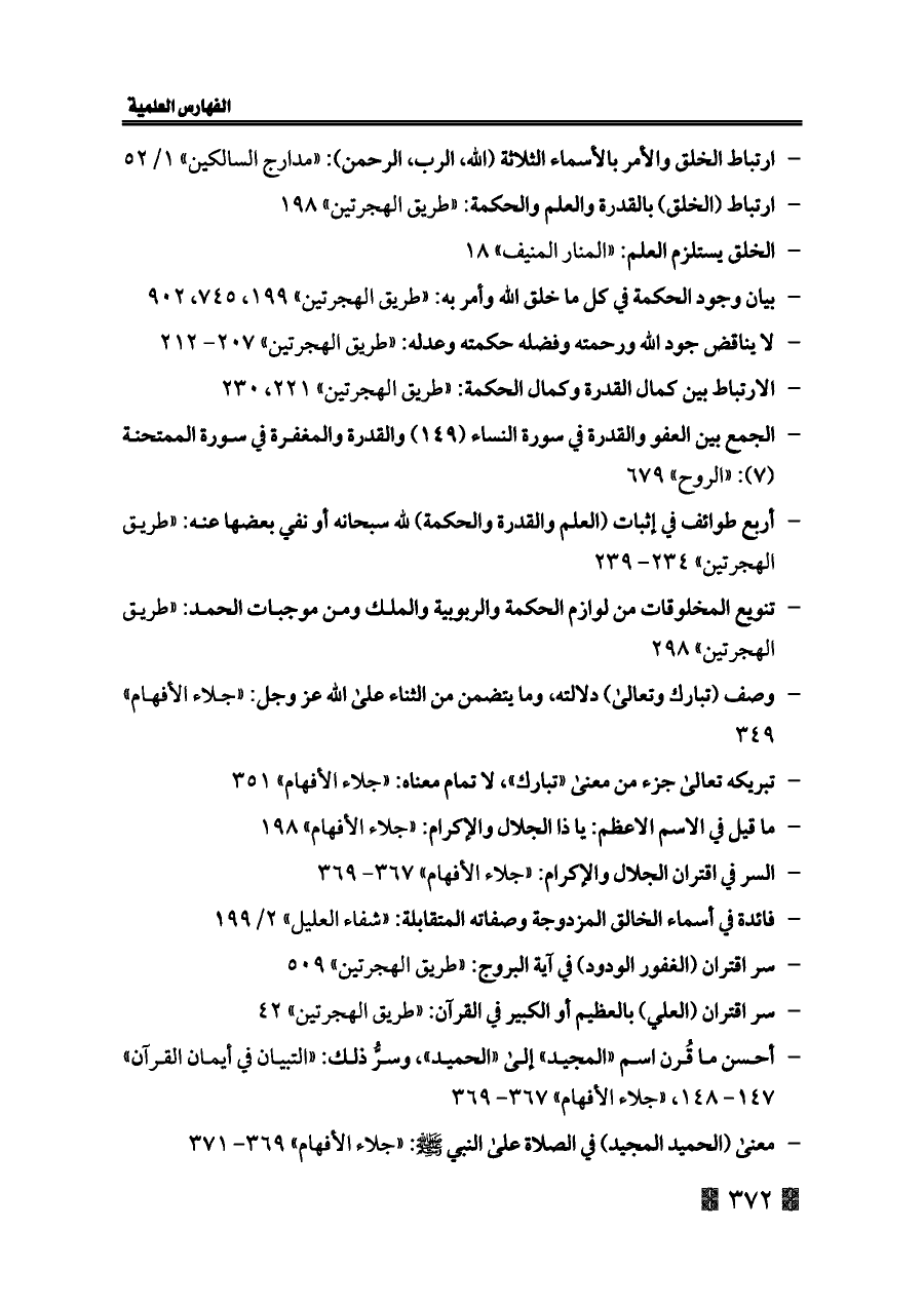 - بيان وجود الحكمة في كل ما خلق الله وأمر به: «طريق الهجرتين» ١٩٩، ٧٤٥، ٩٠٢