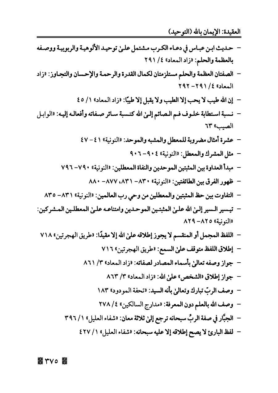 - جواز وصفه تعالى بأسماء المصادر لصفاته: «زاد المعاد» ٣/ ٨٦١